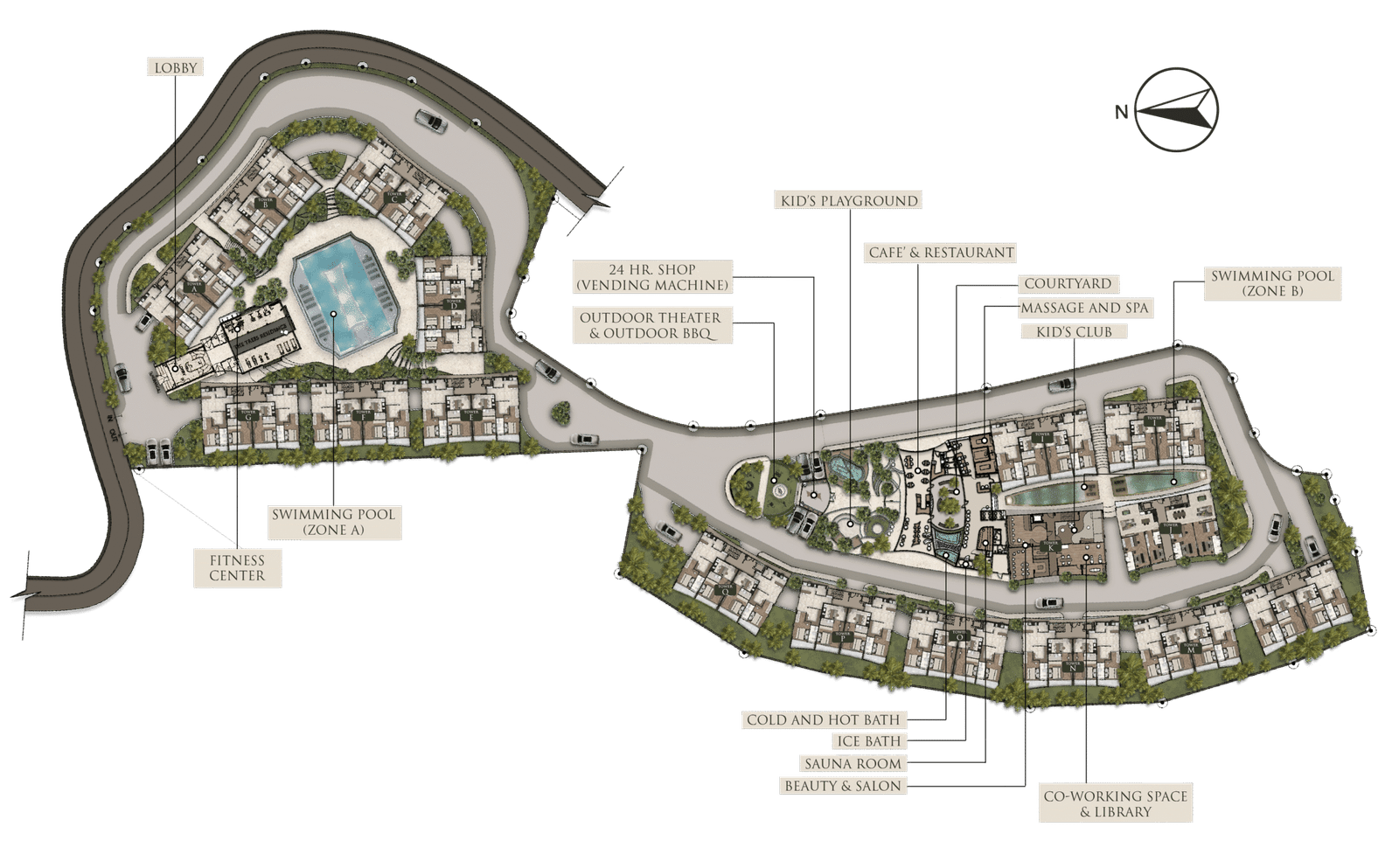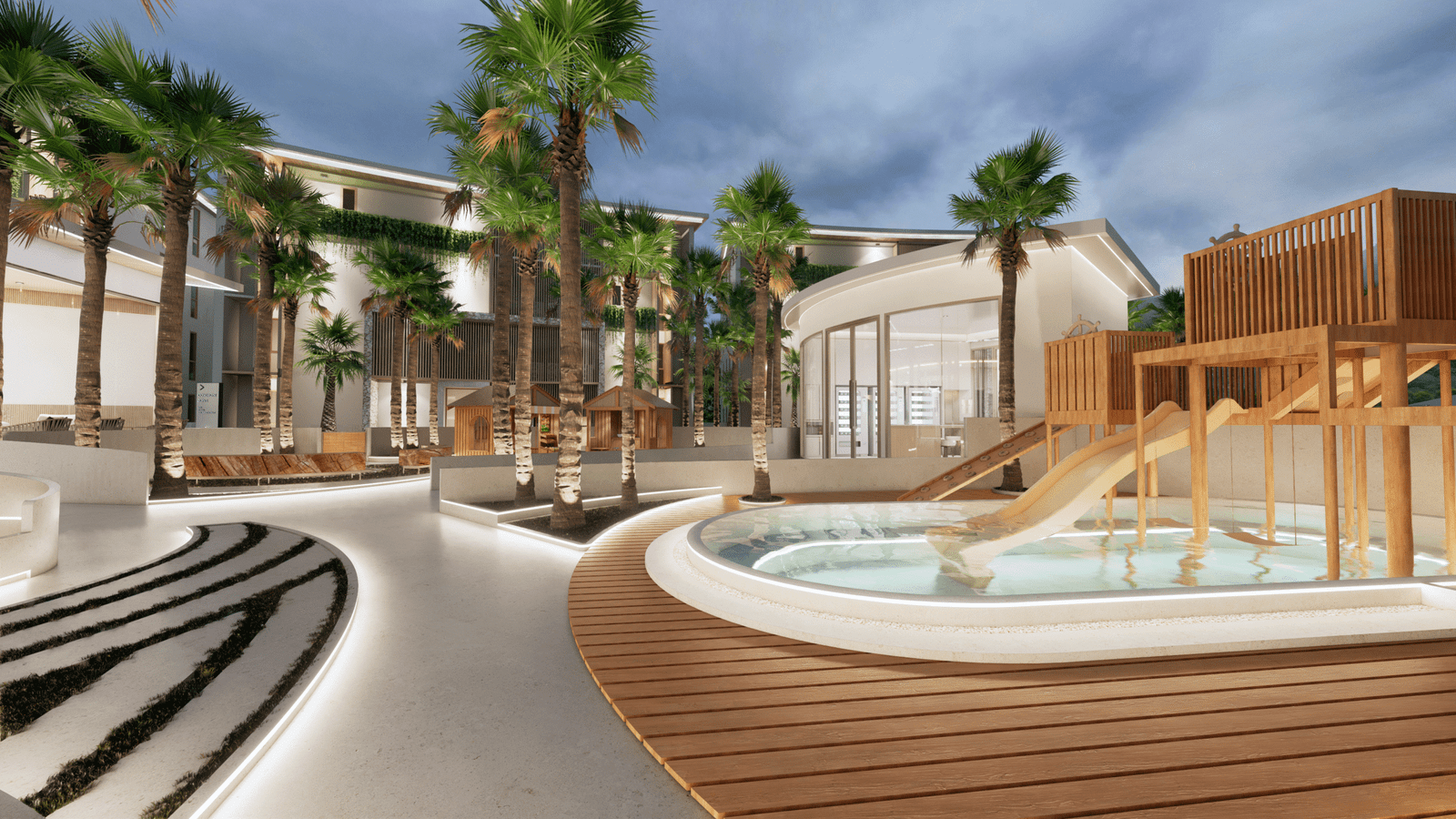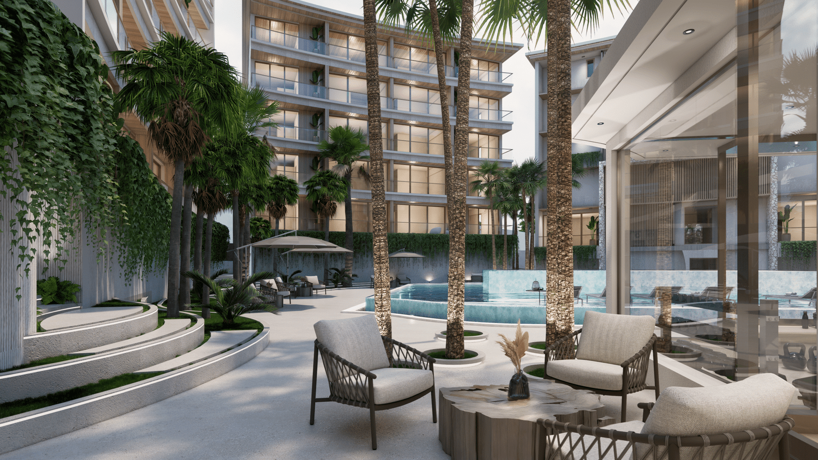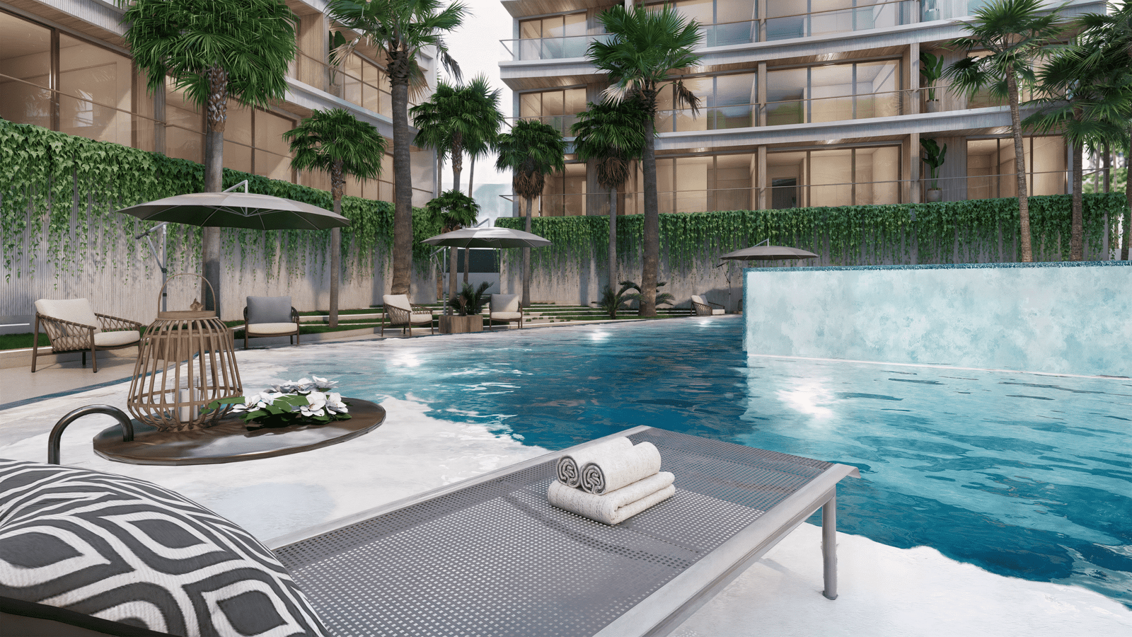 A large pool at the heart of the project, surrounded by lush greenery, offering a serene and relaxing escape.