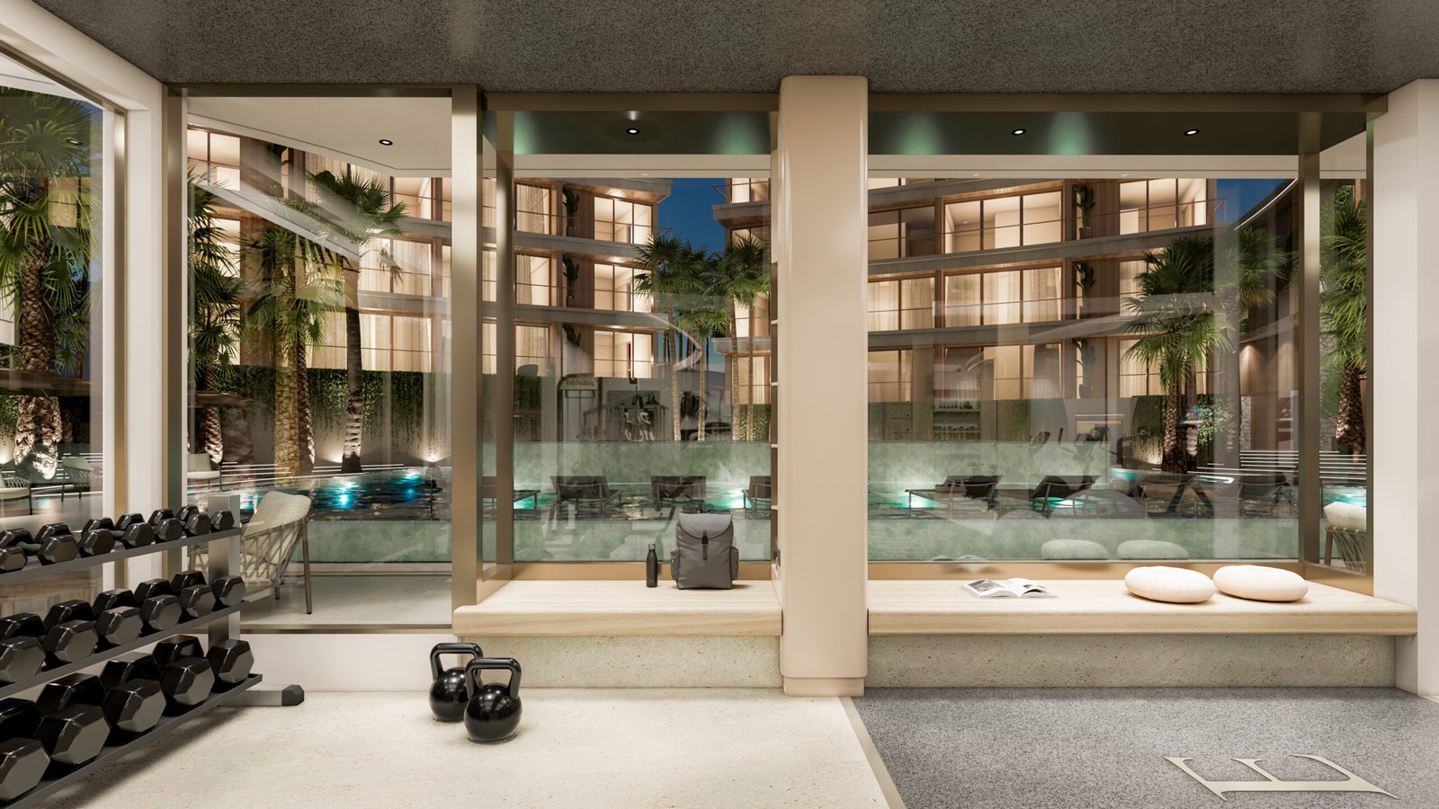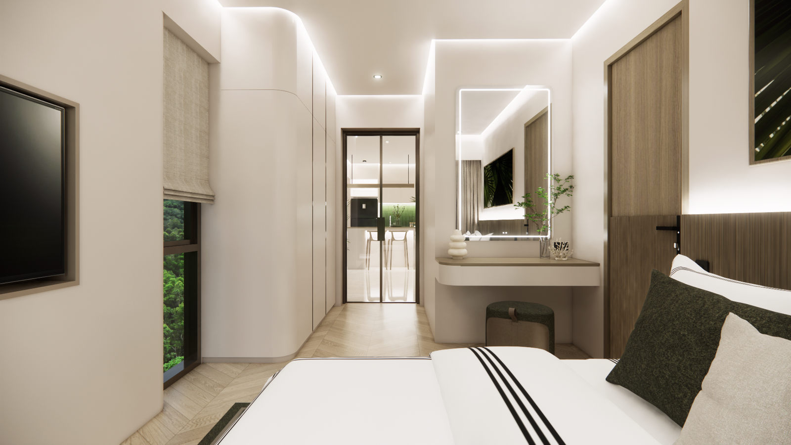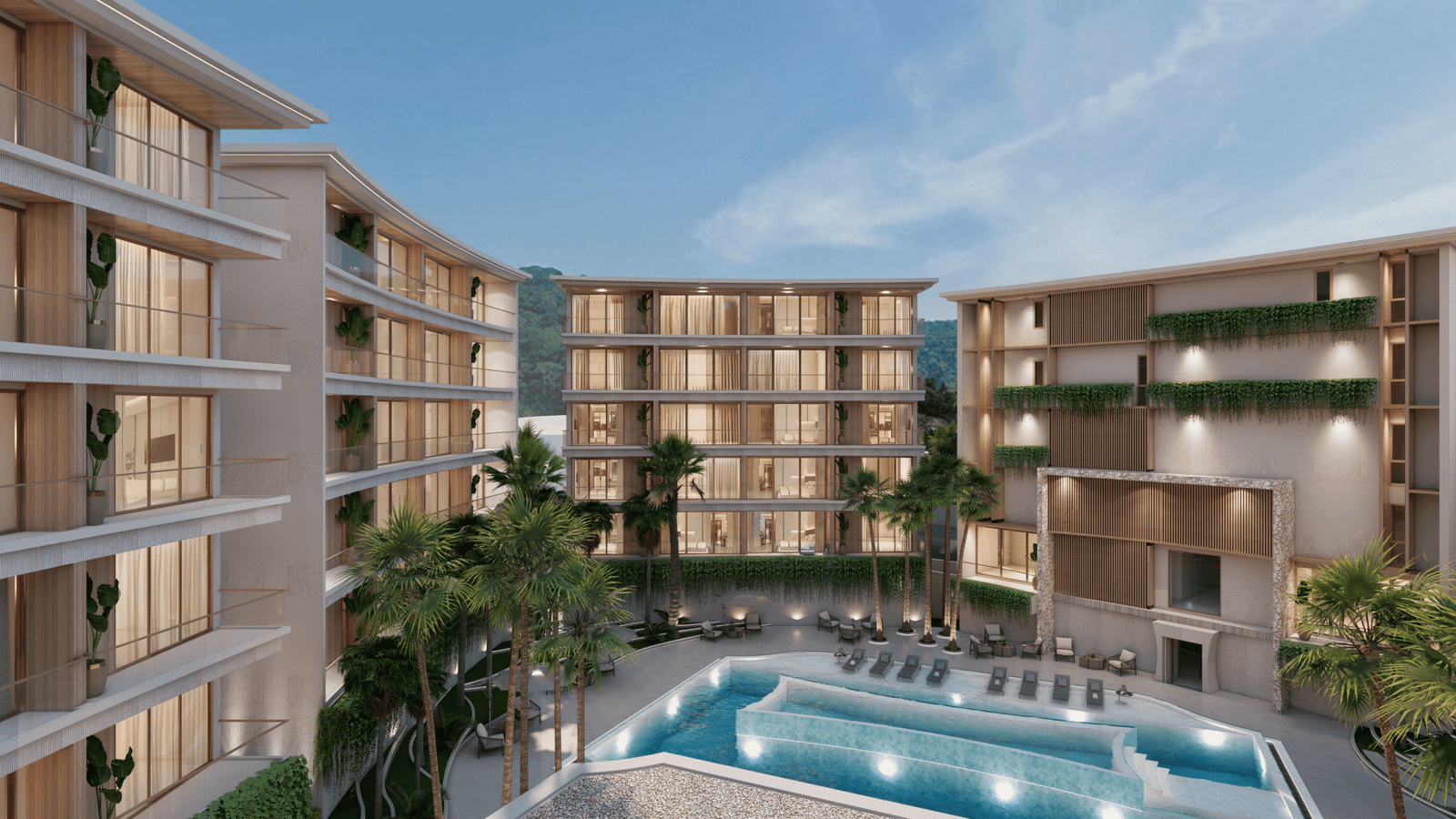 A large pool at the heart of the project, surrounded by lush greenery, offering a serene and relaxing escape.
