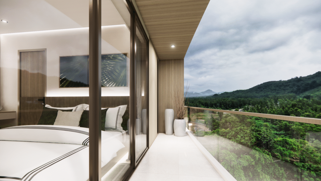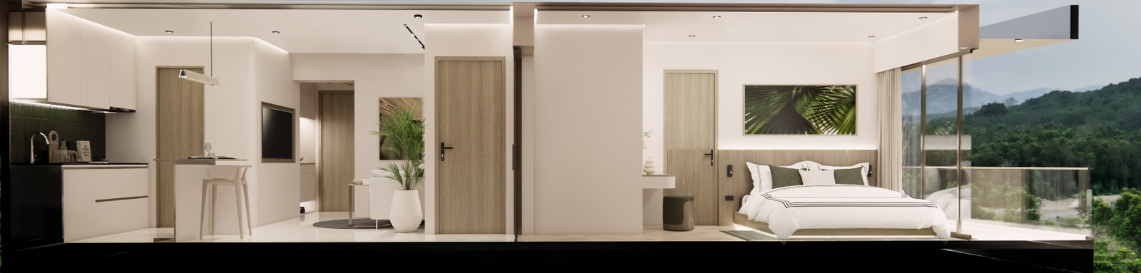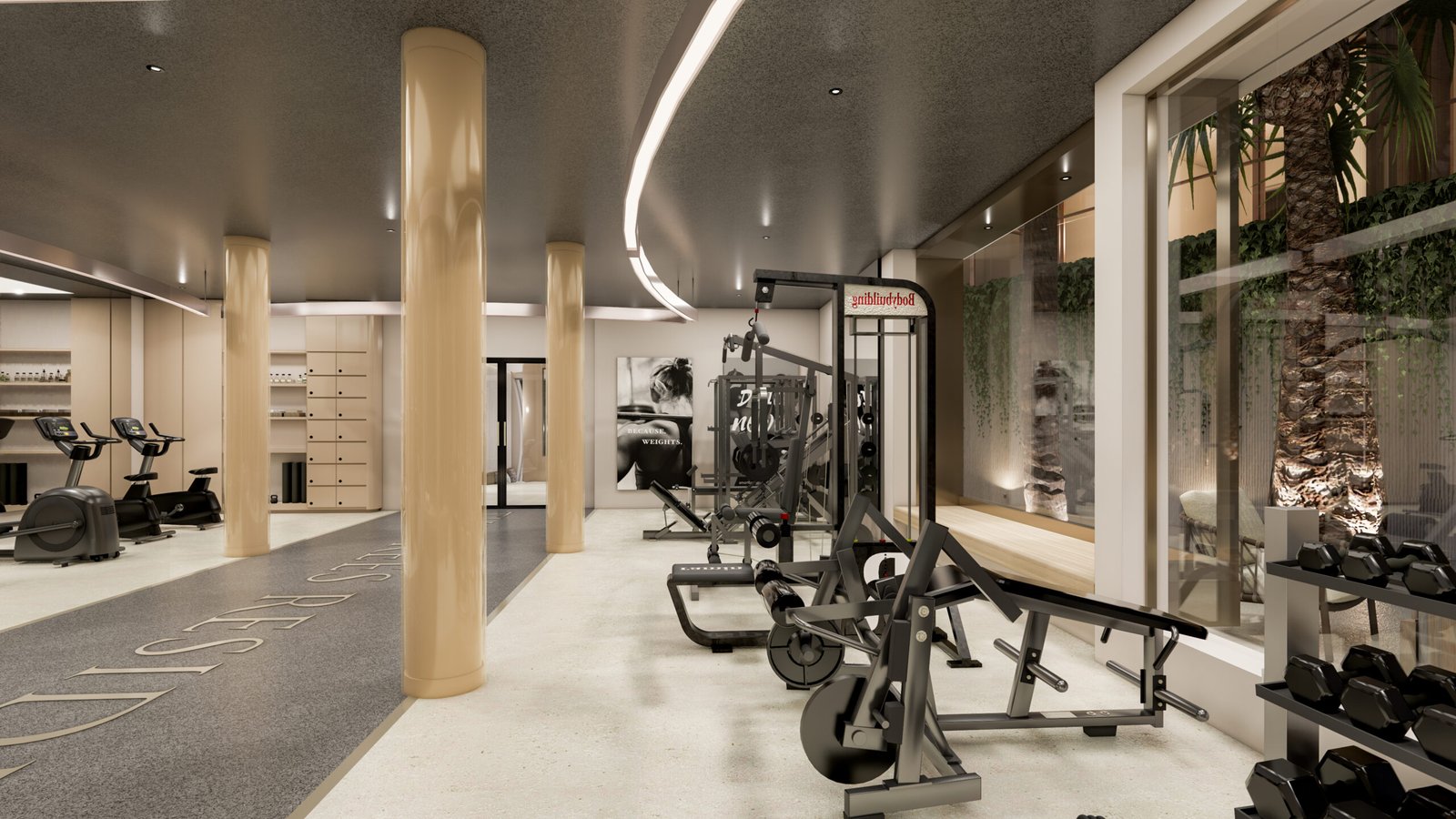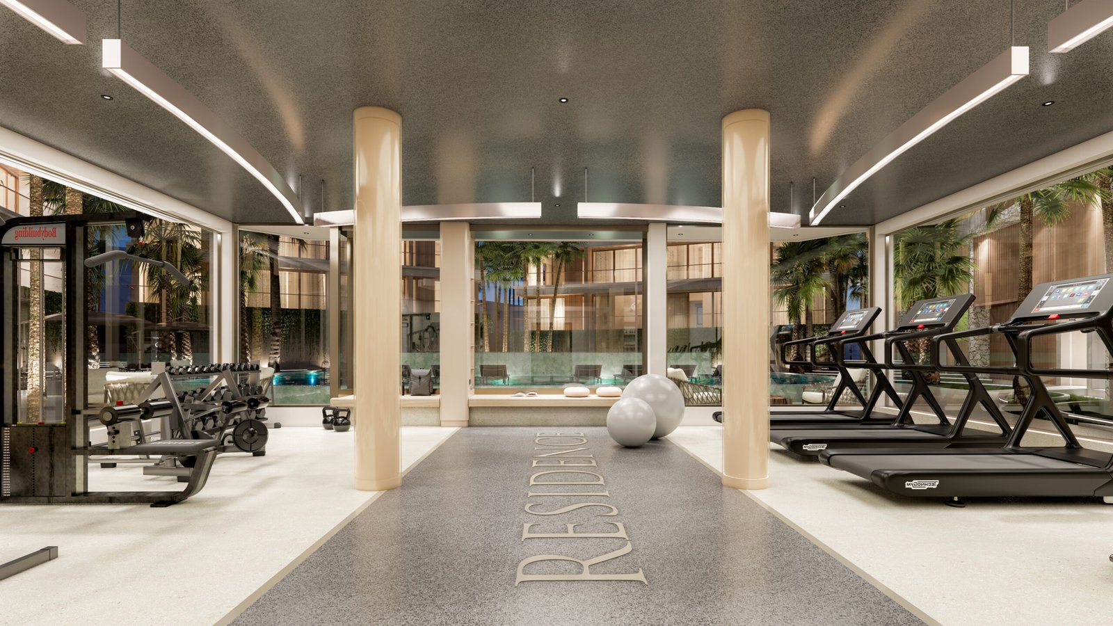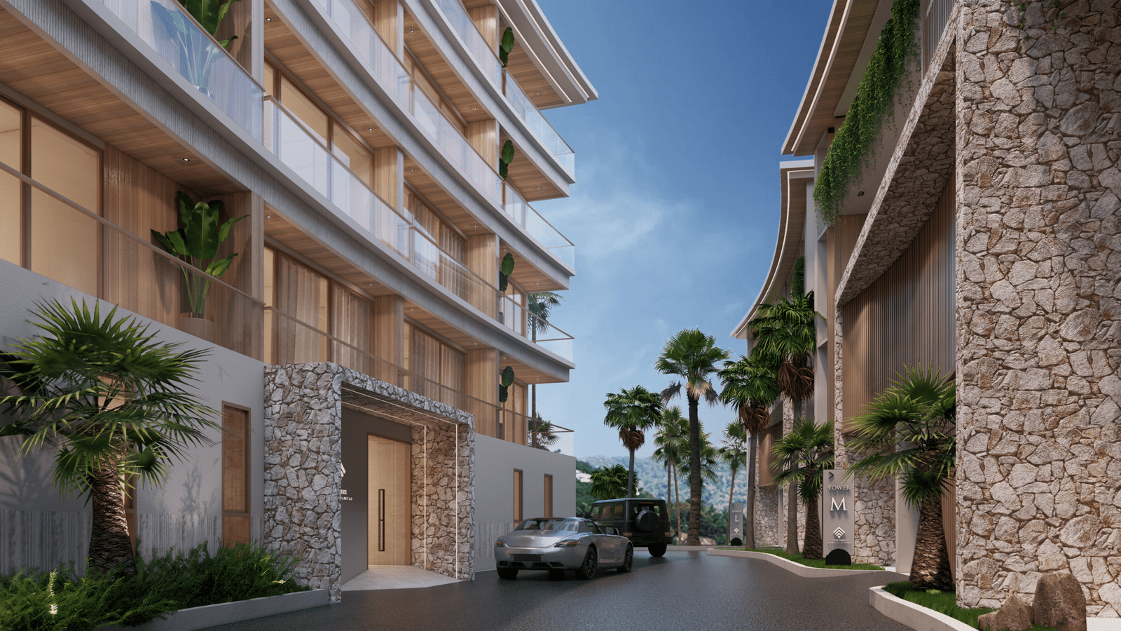 A large pool at the heart of the project, surrounded by lush greenery, offering a serene and relaxing escape.