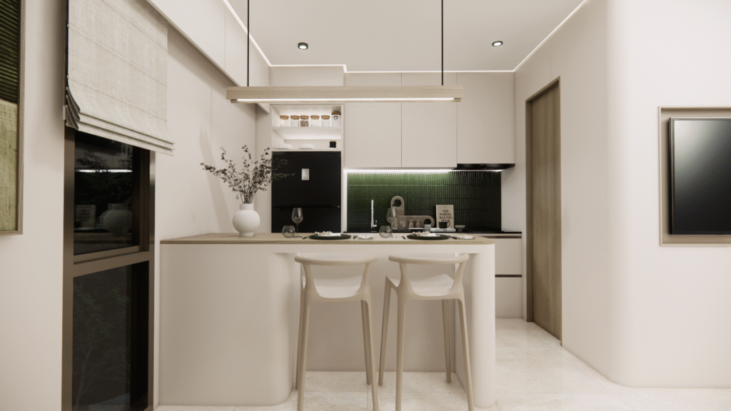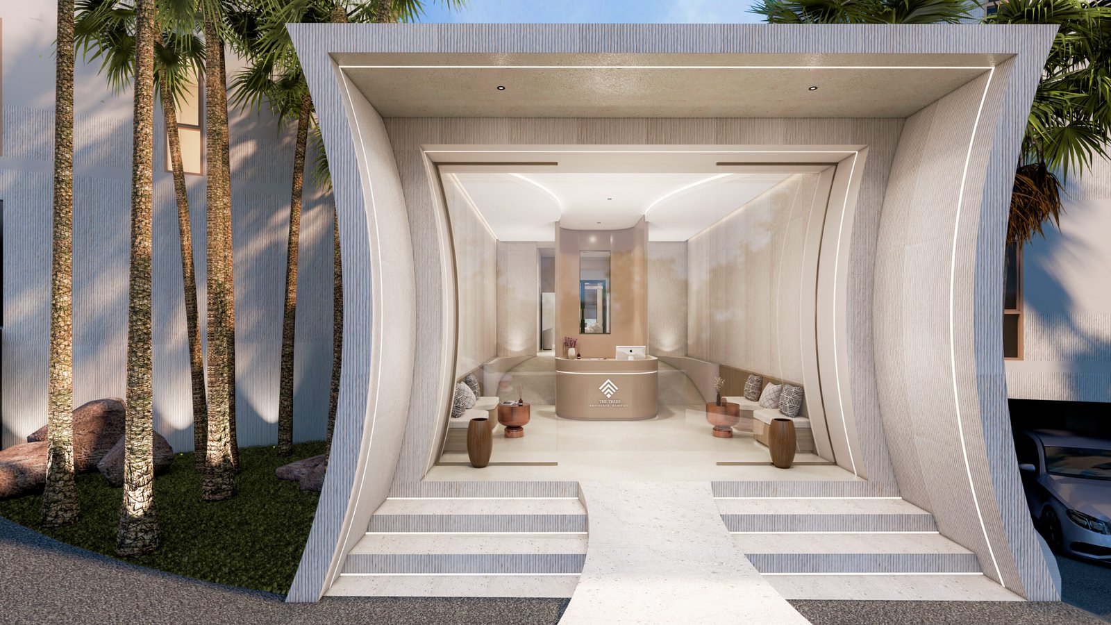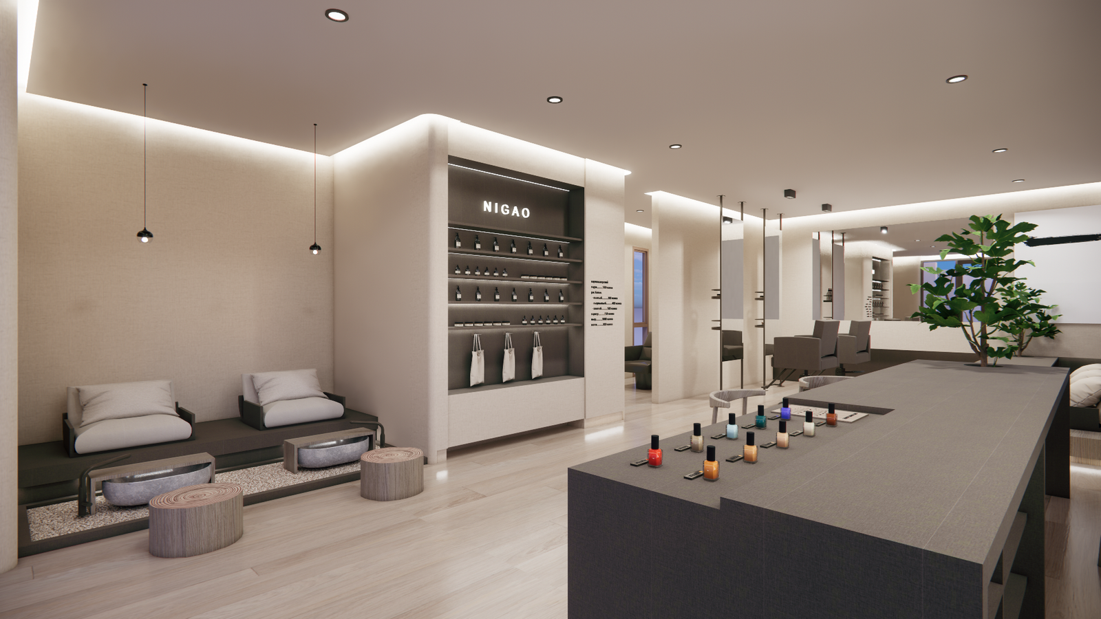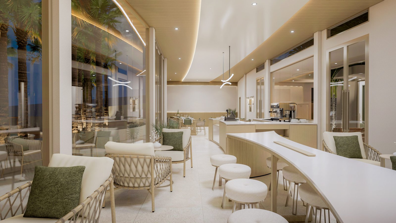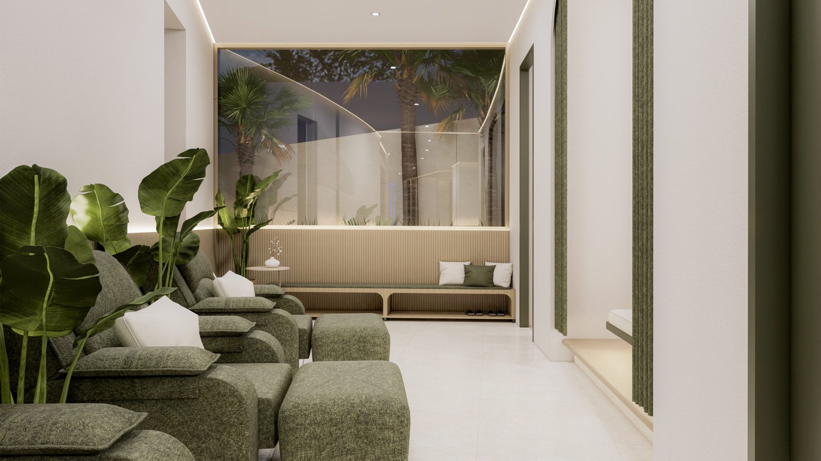 Modern beige tones create a warm, relaxing atmosphere. Bright lighting and an open layout with cozy chairs make for a welcoming and stylish space.