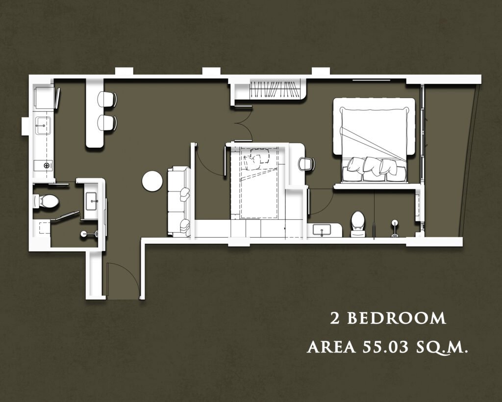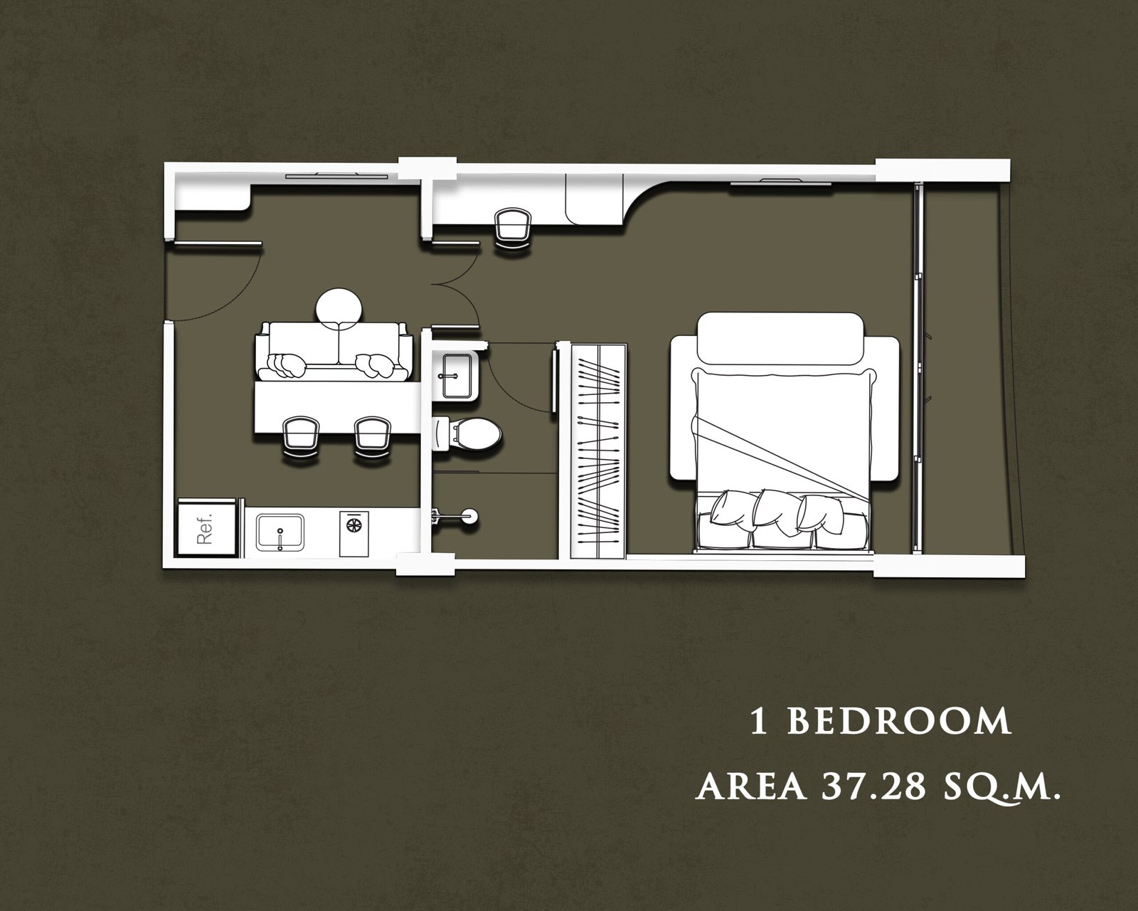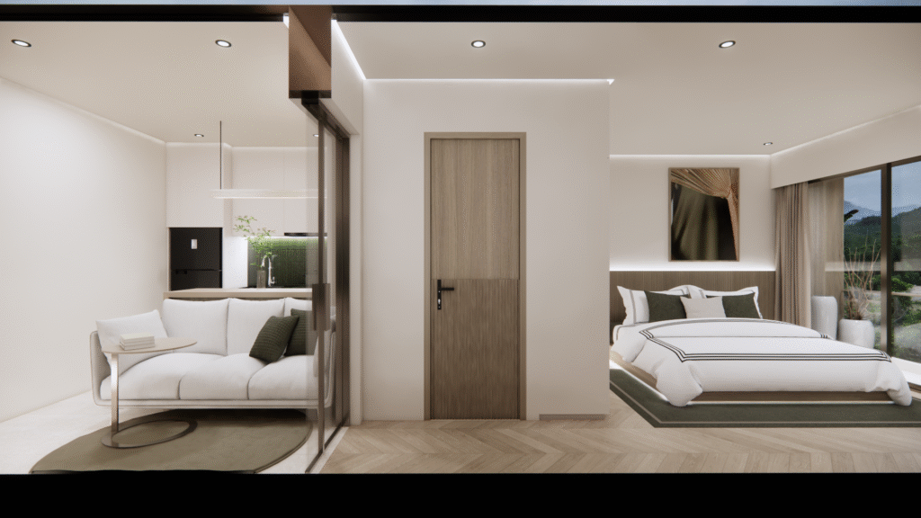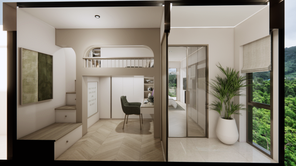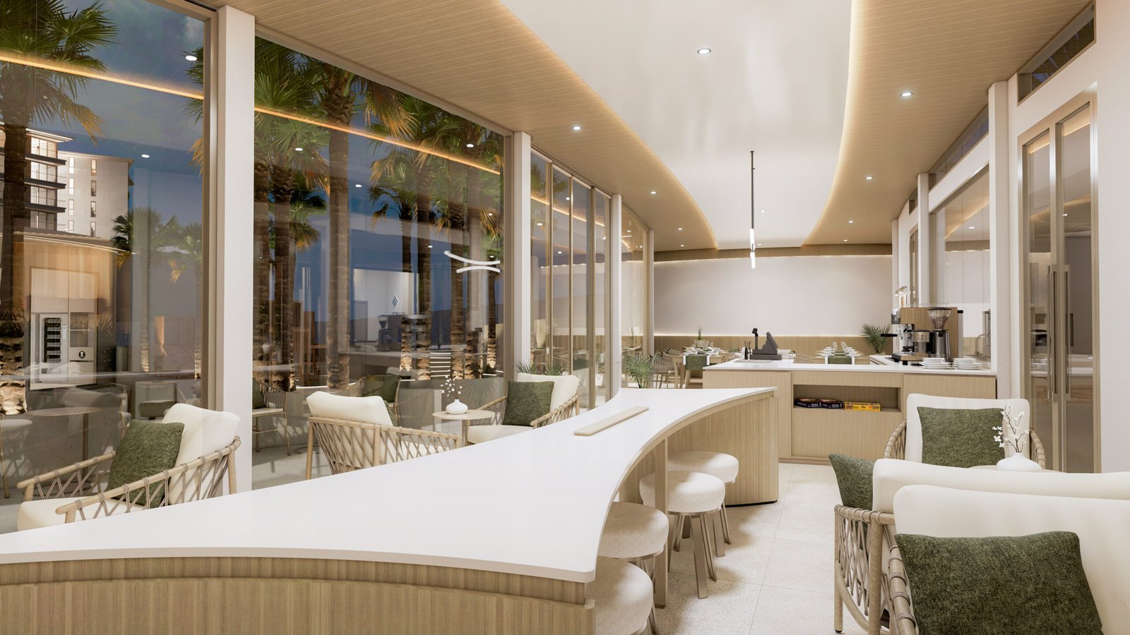 The common area features a contemporary design that blends lush greenery with carefully crafted seating areas using refined materials and shapes, creating a peaceful and quiet atmosphere.