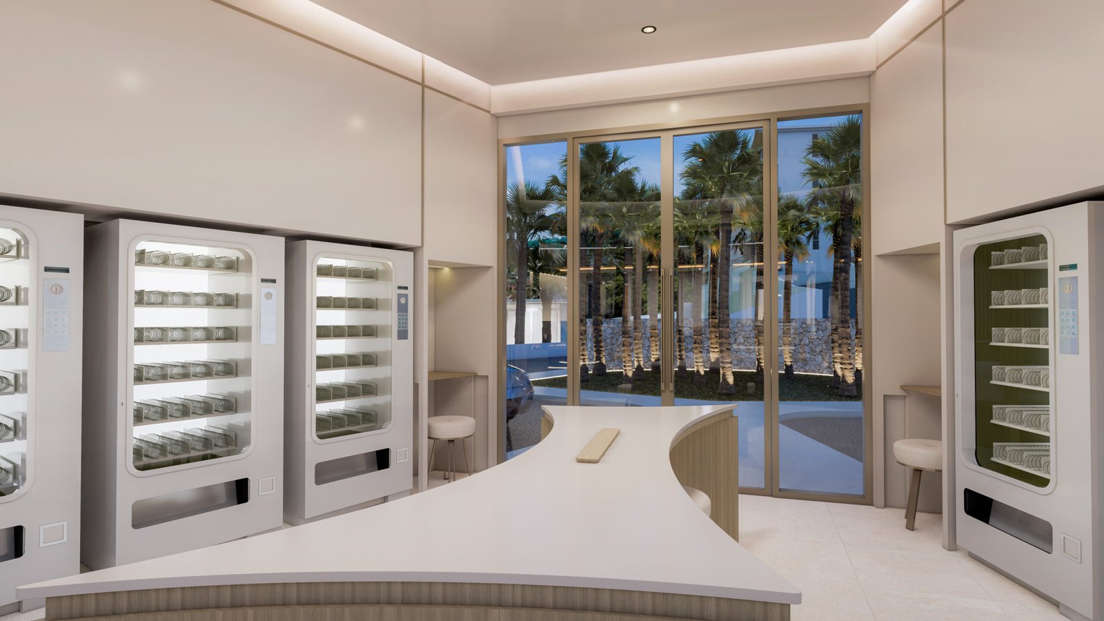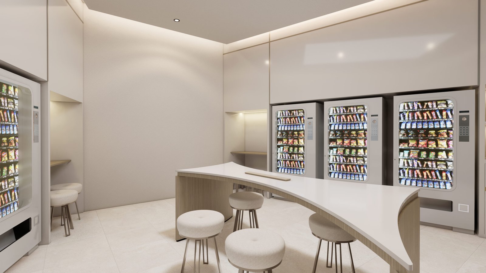 A 24-hour vending machine with seating for relaxation, offering convenience.
