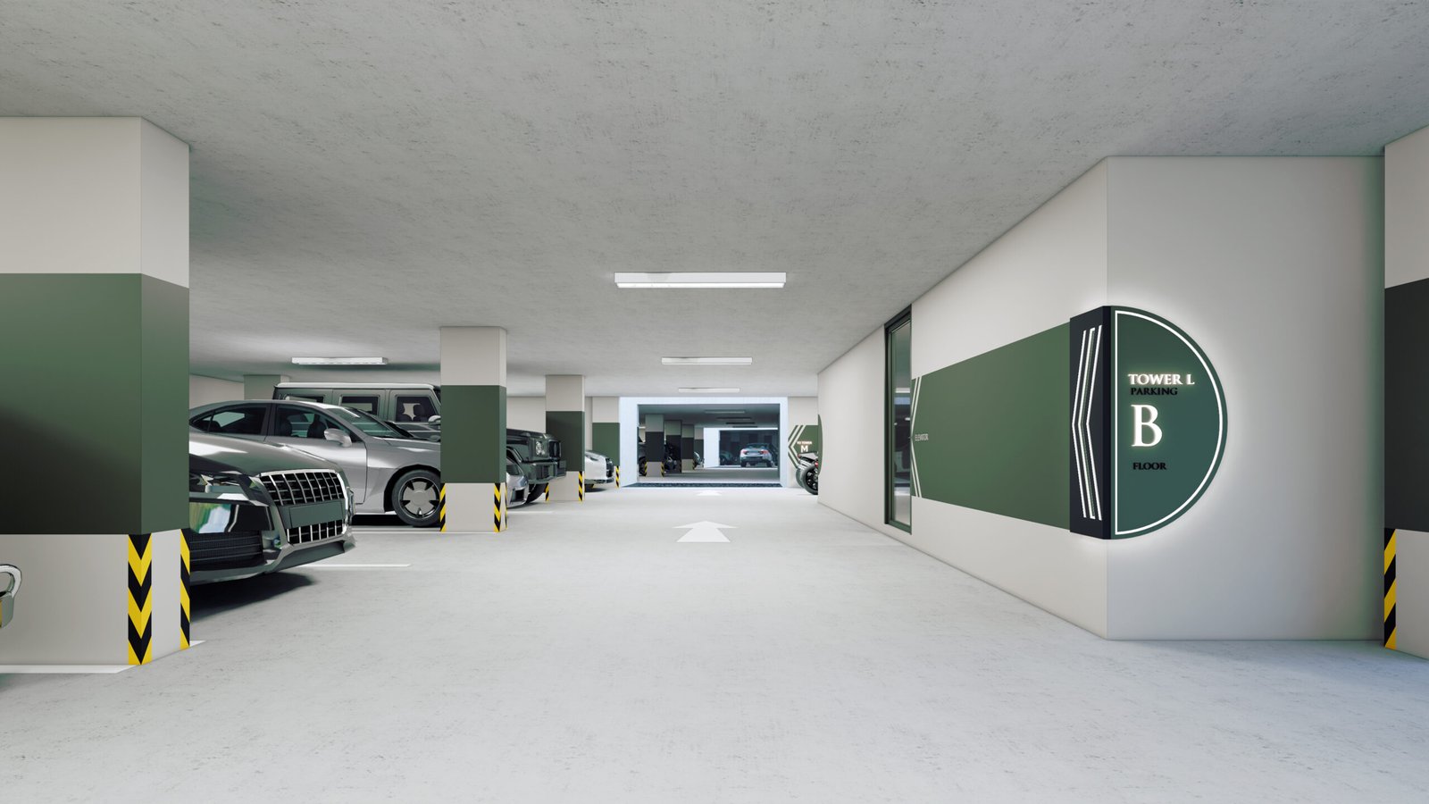 The project features a spacious indoor parking area with clear signage and lighting systems for residents' convenience and safety.