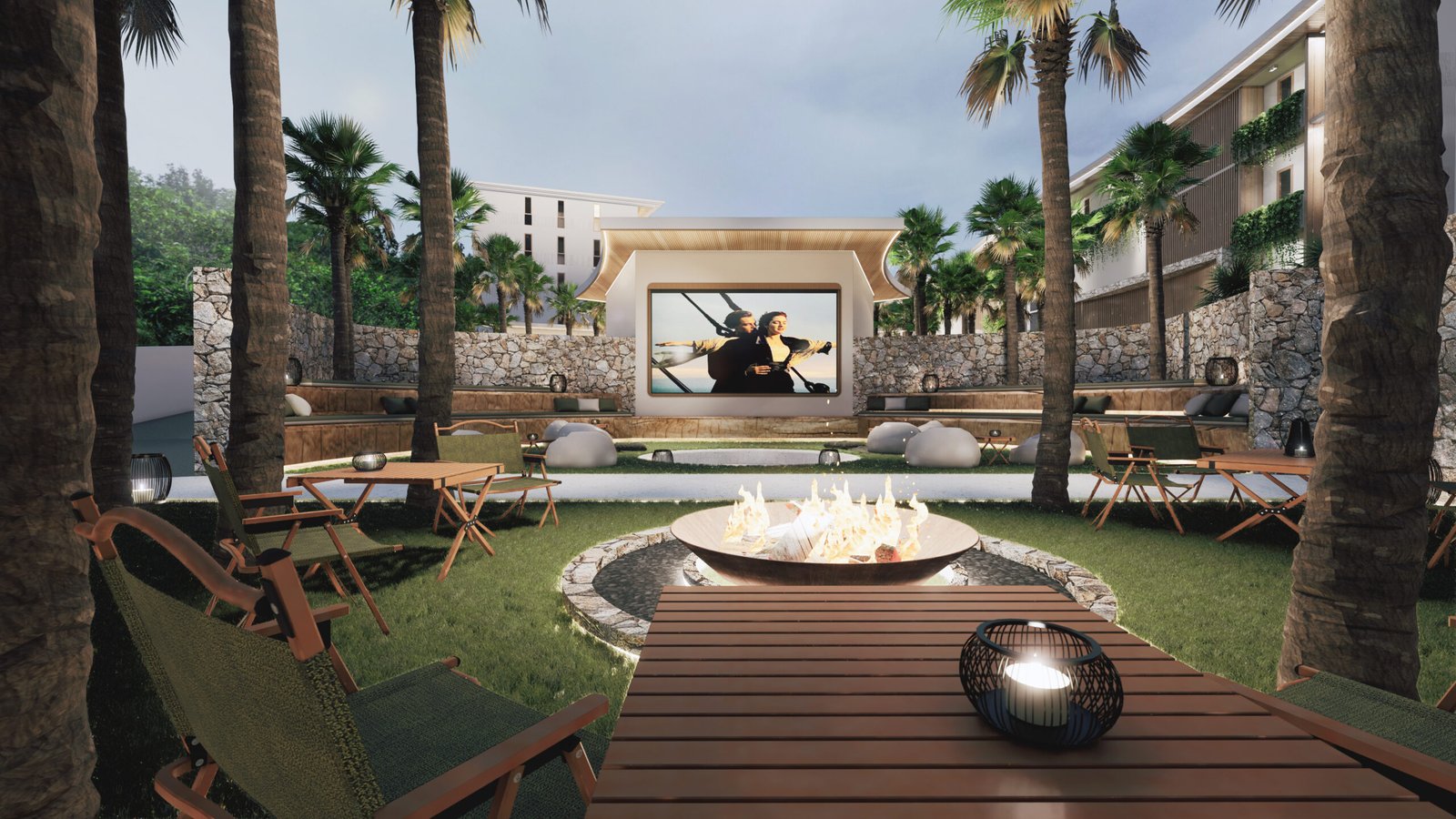 An outdoor family space with a BBQ, large screen, and cozy seating, surrounded by nature for fun and quality time.