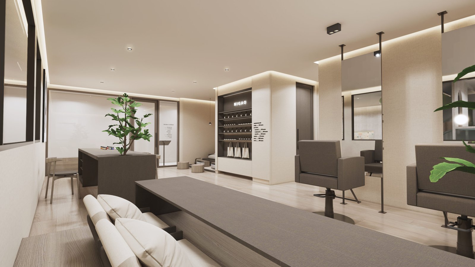 A luxurious, modern minimalist salon that brings out your best self, featuring neatly organized premium hair care products to ensure professional, high-quality service.