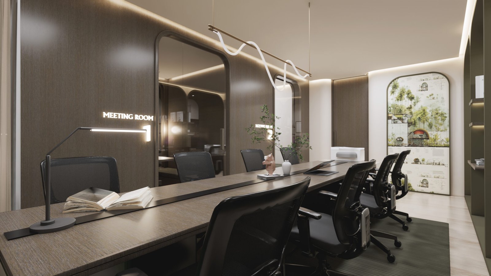 A modern, professional co-working space with desks and chairs for productive group work and meetings.