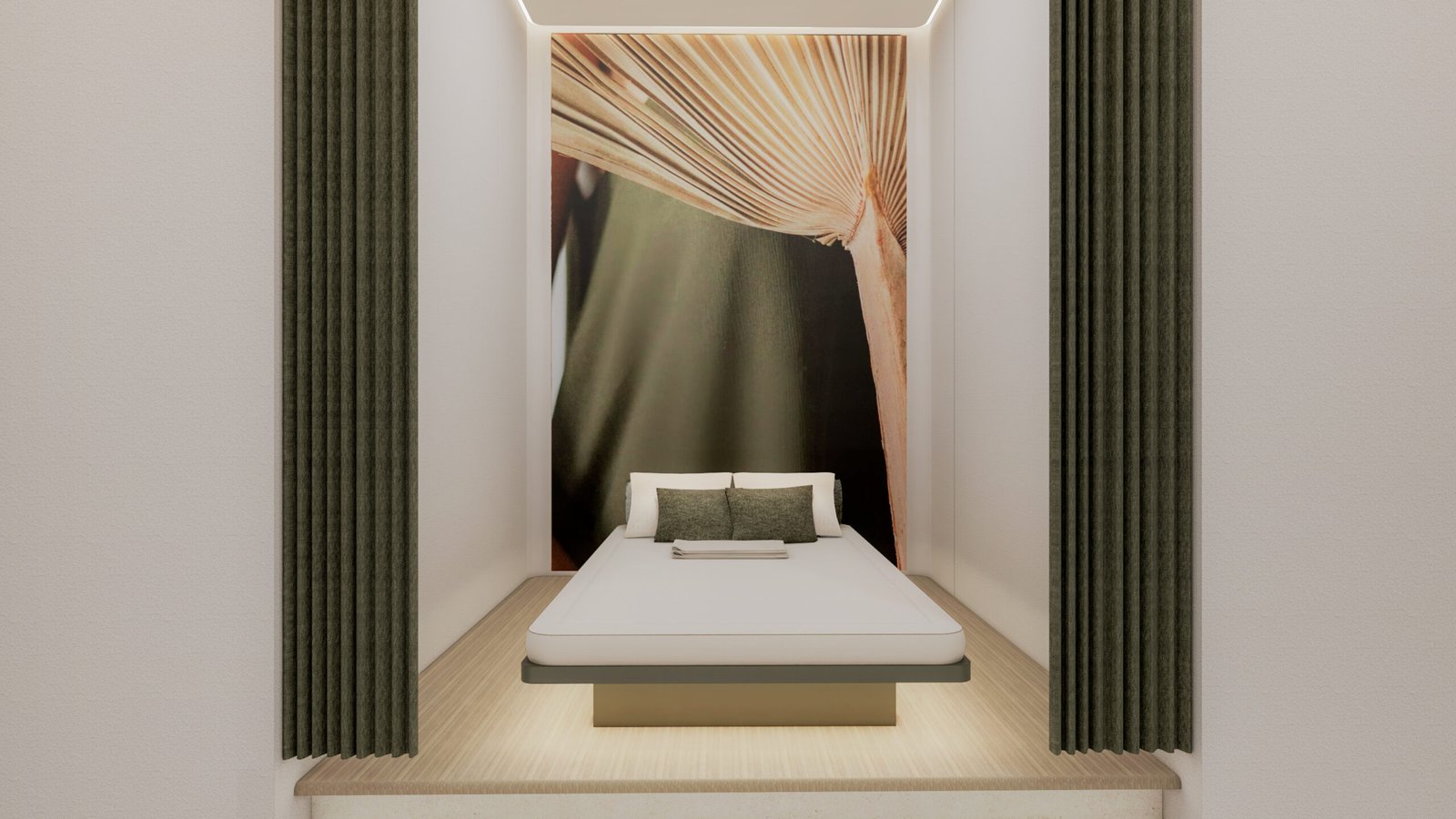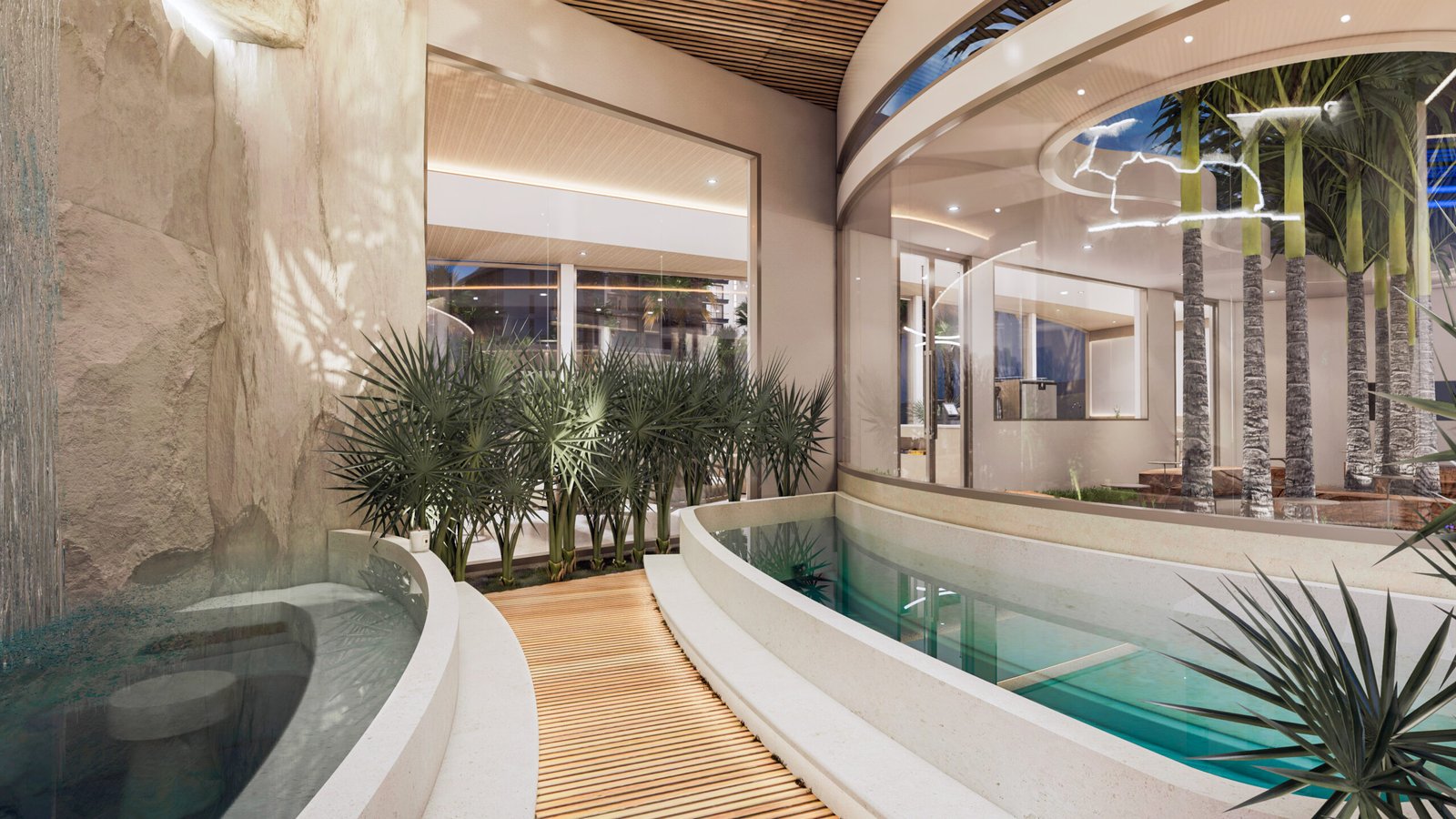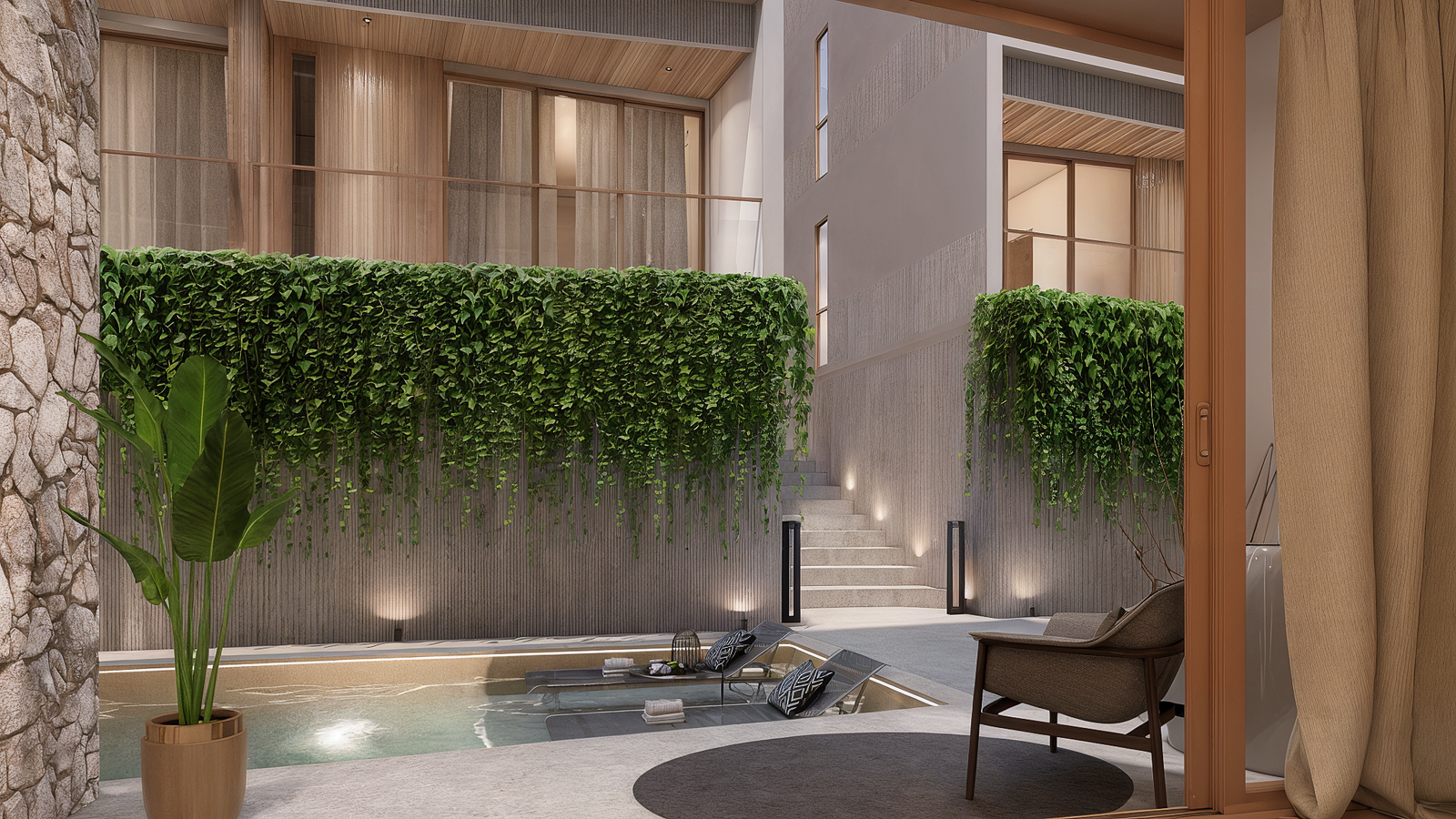 Zone B features a pool decorated with natural wood and stone, surrounded by lush plants. It is perfect for relaxing, whether swimming or lounging on the submerged beds.