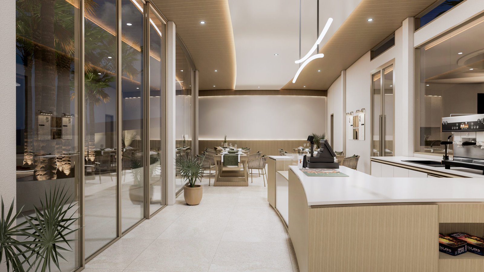 A modern cafe with large windows, offering a calm, warm atmosphere for relaxing and enjoying casual meals.